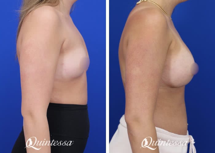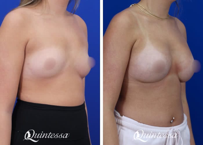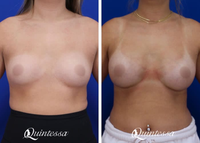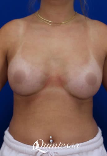 Patient received a bilateral dual plane breast augmentation with 295 cc (left) and 310 cc (right) moderate profile Natrelle Soft Touch silicone implants and TIGR mesh support. Age: 22 Height: 5’4″ Weight: 135 lbs