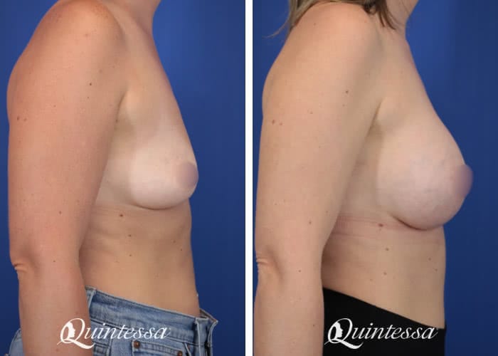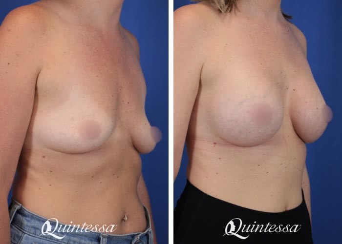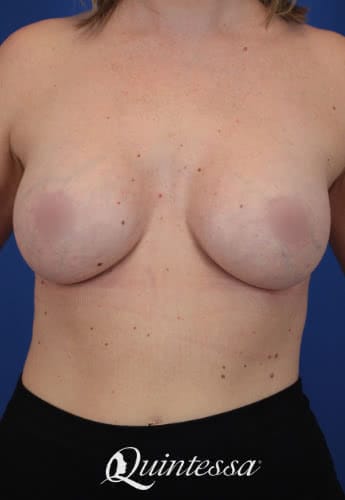This patient reported feeling confident with smaller breasts until breast feeding left her with a significant amount of skin laxity. Patient received a bilateral dual plane breast augmentation with 405 cc moderate profile Natrelle Soft Touch silicone implants.