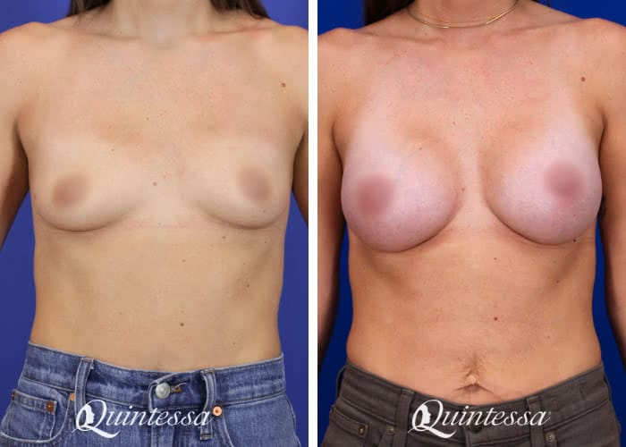 Patient desired a small and natural look after losing breast volume to breast feeding. She received a bilateral dual plane breast augmentation with 295 cc moderate profile Natrelle Soft Touch silicone implants. Age: 33 Height: 5’4″ Weight: 114 lbs