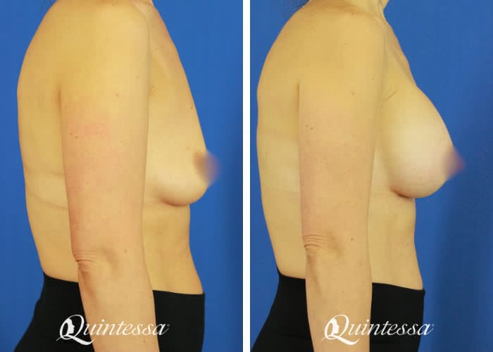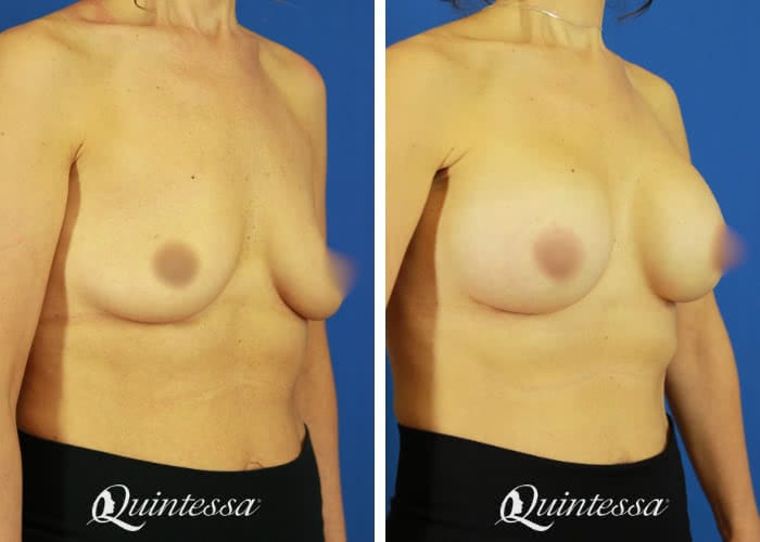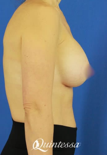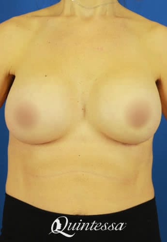 Patient received a bilateral dual plane breast augmentation with 385 cc (left) and 415 cc (right) full profile Natrelle Soft Touch silicone implants with Galaflex mesh support. Age: 45 Height: 5’1″ Weight: 125 lbs