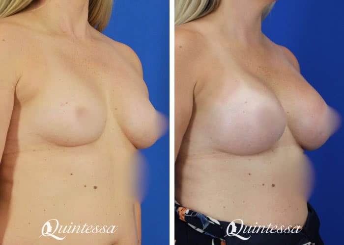 This patient wanted a full but natural look. She received a bilateral dual plane breast augmentation with 350 cc (left) and 415 cc (right) high profile Sientra highly cohesive plus implants. Age: 43 Height: 5’6″ Weight: 155 lbs