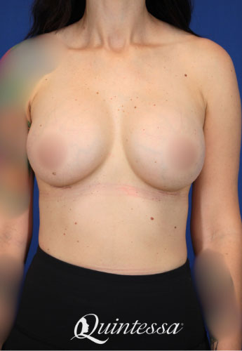 This patient consulted after receiving a bilateral dual plane transaxillary breast augmentation with 325 cc Mentor saline implants in 2011. She desired more volume, better shape, and better implant placement (less lateral). She received a bilateral breast augmentation revision with lateral capsulorrhaphy, to allow the implants to sit more medially creating better cleavage lines. 485 cc Natrelle Soft Touch full profile implants were placed and a periareolar mastopexy was performed to improve nipple positioning. Age: 41 Height: 5’7″ Weight: 133 lbs
