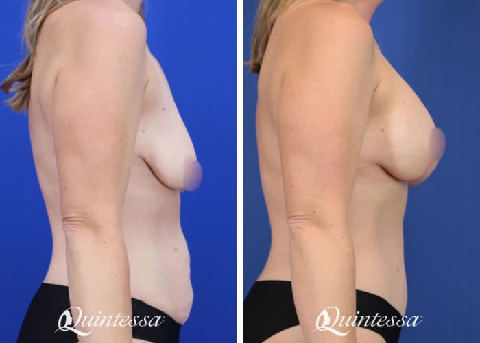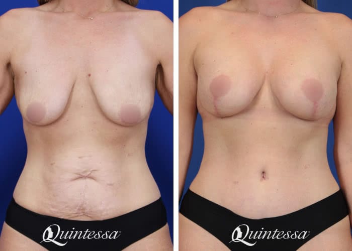 After losing 85 pounds, this patient desired a more contoured look. She received an abdominoplasty with circumferential torso liposuction, liposuction of outer thighs, a bilateral dual plane breast augmentation with 375 cc moderate profile Natrelle Soft Touch silicone implants and a bilateral mastopexy with TIGR mesh support. Age: 40 Height: 5’6″ Weight 180 lbs