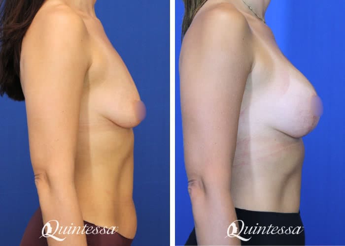 This patient desired more upper pole fullness and participated in an active lifestyle. She received a bilateral dual plane breast augmentation with 275 cc moderate profile Natrelle Soft Touch silicone implants and a bilateral mastopexy. Age: 38 Height: 5’8″ Weight: 150 lbs