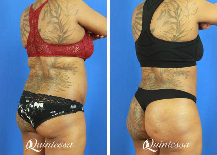 This patient is 5’2 and 145 pounds. She received circumferential (360) liposuction with fat transfer to butt (BBL).