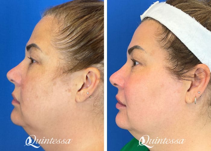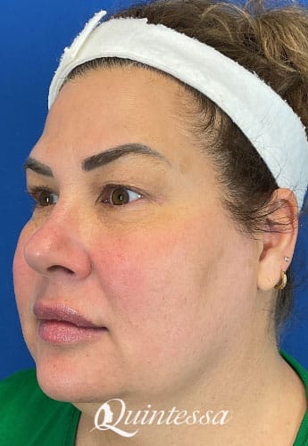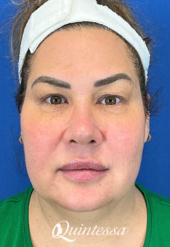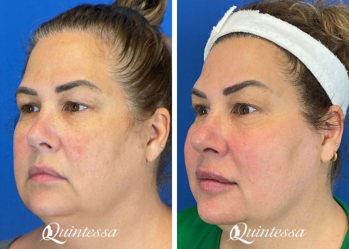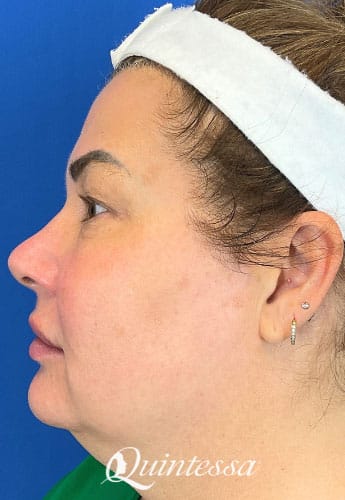 This 49-year-old patient received 9ml of dermal filler to the midface, NLF, Marionette lines, and lips to improve her facial balancing and changing her shape of her face from oval and long to heart shaped and lifted.