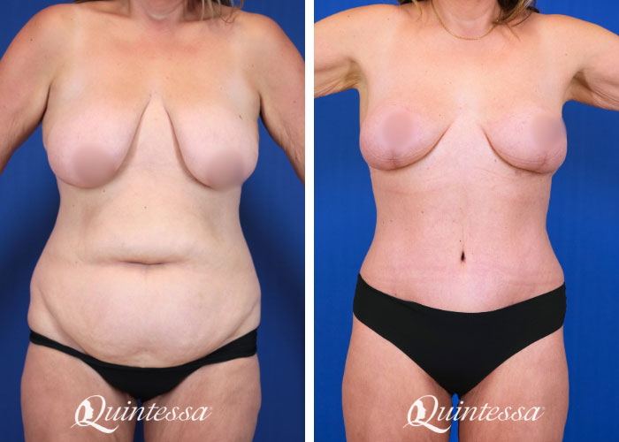 After 2 pregnancies, including a set of twins, this patient was concerned with core weakness, excess skin, and lack of contour. She also desired a subtle increase in breast volume and a more lifted appearance. An abdominoplasty with diastasis recti repair and liposuction of the circumferential trunk was performed. Additionally, 295 cc Natrelle Soft Touch moderate profile dual plane implants were placed. A mastopexy was performed for improved shape and positioning. Age: 31 Height: 5’4″ Weight: 185 lbs