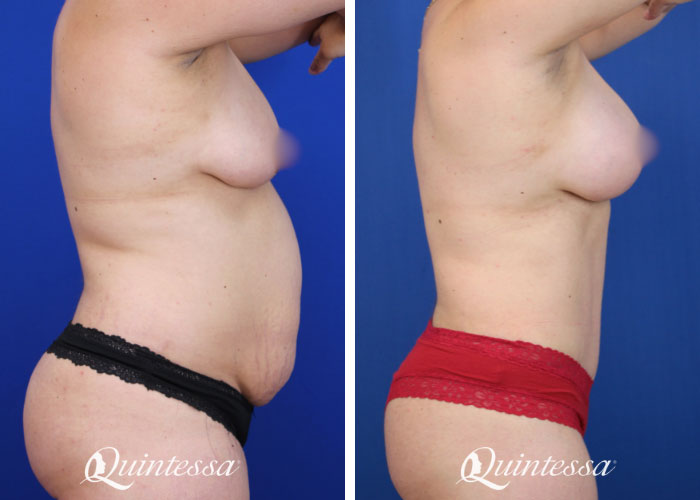 After 2 pregnancies, including a set of twins, this patient was concerned with core weakness, excess skin, and lack of contour. She also desired a subtle increase in breast volume and a more lifted appearance. An abdominoplasty with diastasis recti repair and liposuction of the circumferential trunk was performed. Additionally, 295 cc Natrelle Soft Touch moderate profile dual plane implants were placed. A mastopexy was performed for improved shape and positioning. Age: 31 Height: 5’4″ Weight: 185 lbs