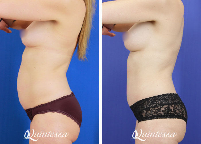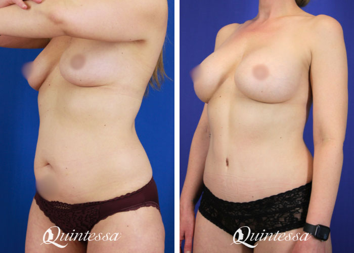 This patient was concerned about core weakness and asymmetry of her breasts after 3 pregnancies. An abdominoplasty with diastasis recti repair was performed to improve core weakness and remove excess abdominal skin. She also received a bilateral dual plane breast augmentation with 310 cc (right) and 345 cc (left) Natrelle Soft Touch moderate profile implants to address breast asymmetry. A mastopexy was performed to improve breast shape and positioning. Age: 41 Height: 5’5″ Weight: 155 lbs