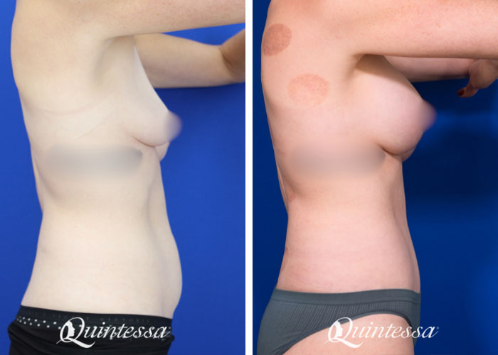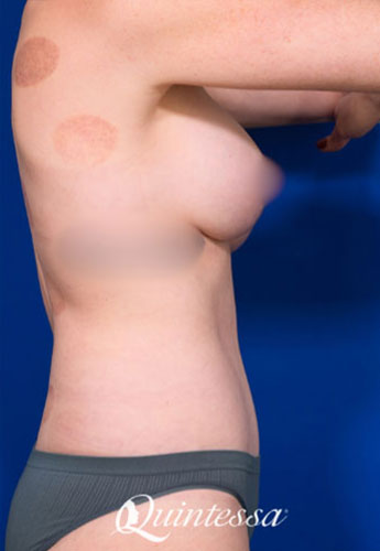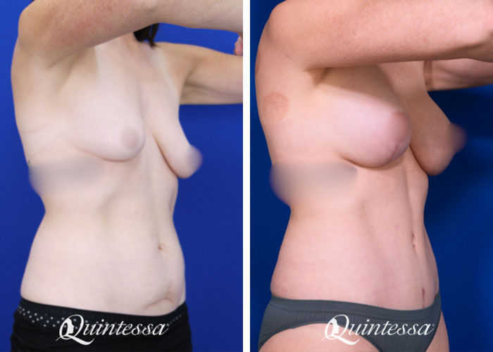 This patient experienced complications with diastasis recti after 2 pregnancies as well as deflated and uneven breasts. She desired more upper pole fullness in her breasts, and a small boost in volume. This was achieved with a bilateral subfascial breast augmentation with 360 cc (right) and 320 cc (left) Motiva Ergonomix in the demi profile. A bilateral mastopexy was performed and reinforced with TIGR mesh to promote longevity of the results. An abdominoplasty with diastasis recti repair and anterior liposuction for contour was also performed. Age: 43 Height: 5’9″ Weight: 145 lbs