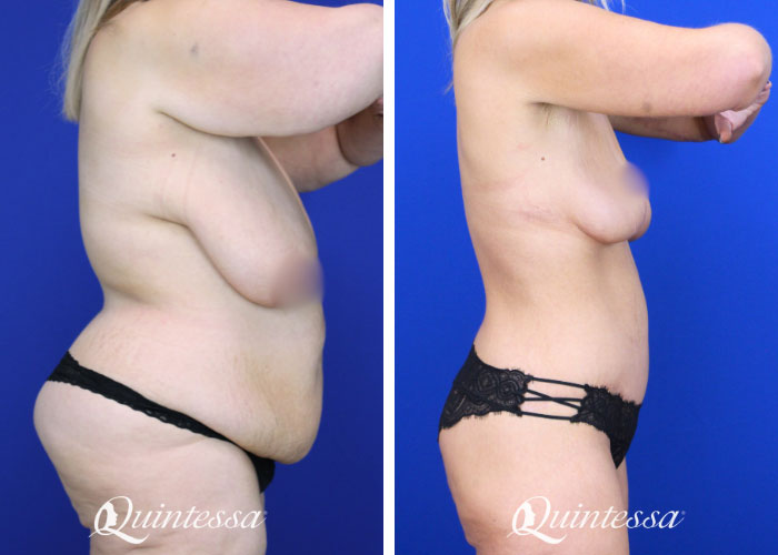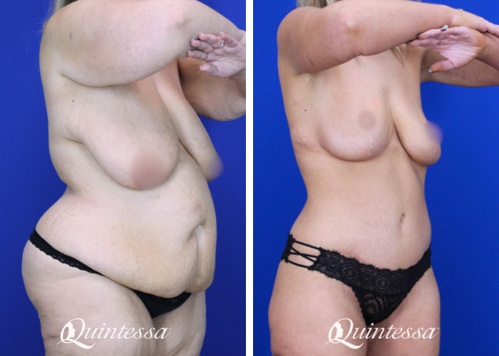 This patient consulted after 3 pregnancies with one set of twins, a gastric sleeve placement, and after losing approximately 90 pounds. She was concerned with loose skin on the abdomen, arms, thighs, and breasts, as well as core weakness. She had staged procedures, meaning that all areas could not be safely addressed in a single surgery. First, a bilateral brachioplasty (arm lift) and breast reduction was performed to address laxity of the arms and breasts. Second, a torsoplasty (lower body lift) with diastasis recti repair addressed skin laxity of the circumferential torso and core weakness. The final procedure was a vertical medial thigh lift to address laxity of the thighs. Age: 30 Height: 5’5″ Weight: 220 lbs
