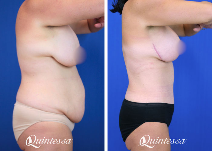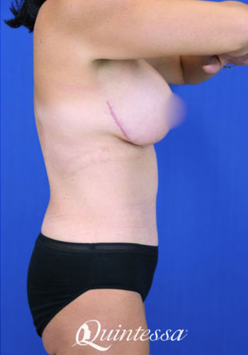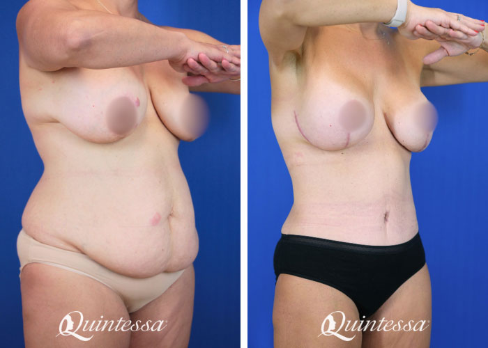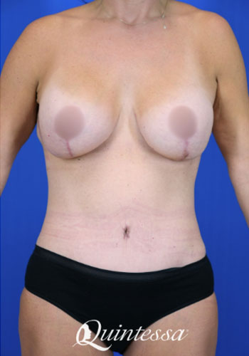 After four pregancies, this patient was looking to restore abdominal contours, fix muscle separation, and revise a previous breast surgery. received a full abdominoplasty with circumferential torso liposuction. She had dual plane saline implants. The left implant was ruptured. She received a revision breast augmentation with a plane conversion to subfascial placement. This patient received 360 cc (left) and 425 cc (right) Motiva Round implants in the Demi profile as well as a mastopexy revision with TIGR mesh support. Age: 38 Height: 5’5″ Weight: 181 lbs
