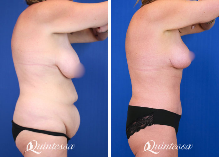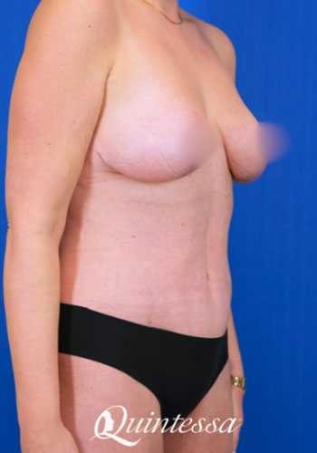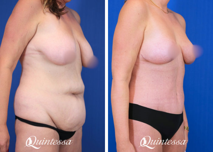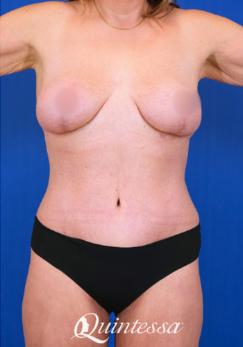 After losing 90 lbs, this patient was left with a significant amount of loose skin on her abdomen, back, and breasts. She received a torsoplasty with a wise-pattern mastopexy. Age: 46 Height: 5’10” Weight: 185 lbs